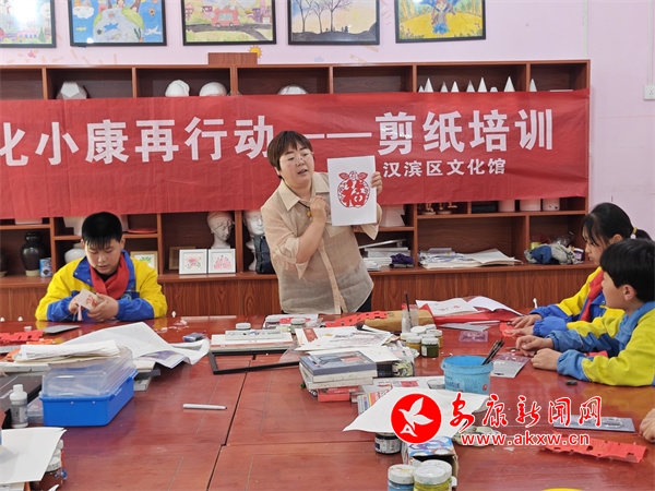本網(wǎng)訊(通訊員 曹曉琳 劉純汐 夏勤艷)5月14日,漢濱區(qū)文化館聯(lián)合葉坪鎮(zhèn)文化分館舉辦“文化小康再行動(dòng)”系列文化進(jìn)校園活動(dòng),為葉坪鎮(zhèn)葉坪小學(xué)送去音樂(lè)、舞蹈、剪紙免費(fèi)培訓(xùn)以及版畫(huà)作品流動(dòng)展覽。以城鄉(xiāng)均等的藝術(shù)體驗(yàn)活動(dòng),播撒傳統(tǒng)文化藝術(shù)的種子。