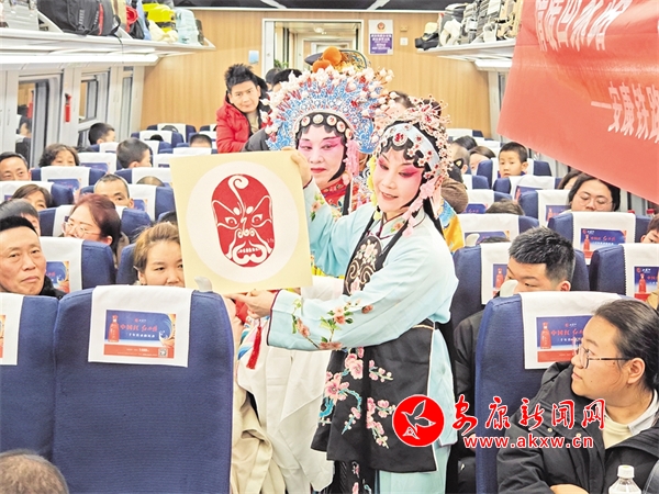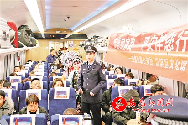 火車穿越秦巴山水間,途中,來自安康漢調(diào)二黃研究院的專業(yè)演員和地方民間漢調(diào)二黃愛好者們一同表演了國(guó)家級(jí)非物質(zhì)文化遺產(chǎn)——漢調(diào)二黃經(jīng)典戲曲演唱,并為旅客們講解漢調(diào)二黃戲曲知識(shí),與旅客們開展互動(dòng)交流,讓旅客親身體驗(yàn)漢調(diào)二黃戲服道具,感受漢調(diào)二黃的獨(dú)特藝術(shù)魅力。來自漢濱區(qū)文化館的漢濱剪紙技藝傳承人為旅客們展示講解了安康市級(jí)非物質(zhì)文化遺產(chǎn)——漢濱剪紙技藝,向參與互動(dòng)的旅客送上了親手創(chuàng)作的漢濱剪紙作品,提前送上新春祝福;顒(dòng)中,西安鐵路公安局安康公安處的民警們和文藝工作者們一同宣傳普及了反詐知識(shí),進(jìn)一步提升旅客的安全防范意識(shí)。