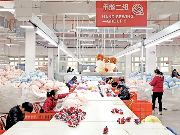 毛絨玩具生產(chǎn)車間里,女工們正在手工縫制