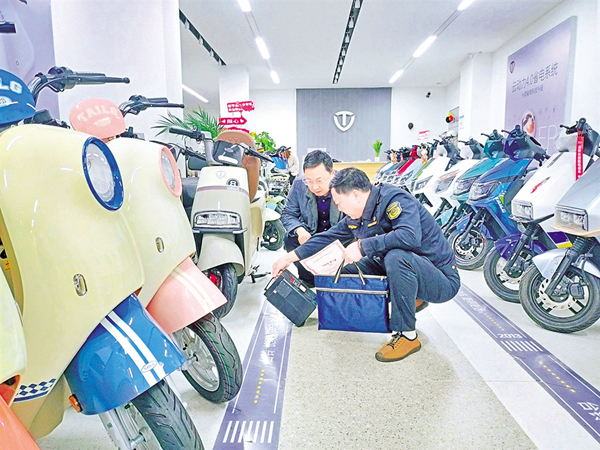 ①執(zhí)法人員檢查電動(dòng)自行車配件。席瑾 攝②向電動(dòng)自行車銷售人員了解情況。席瑾 攝本網(wǎng)訊(通訊員 柯賢會(huì) 喬。罢埑鍪倦妱(dòng)自行車合格證件!薄按蜷_蓋板,看看……