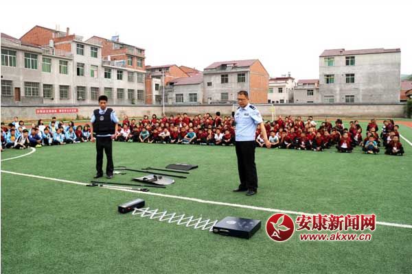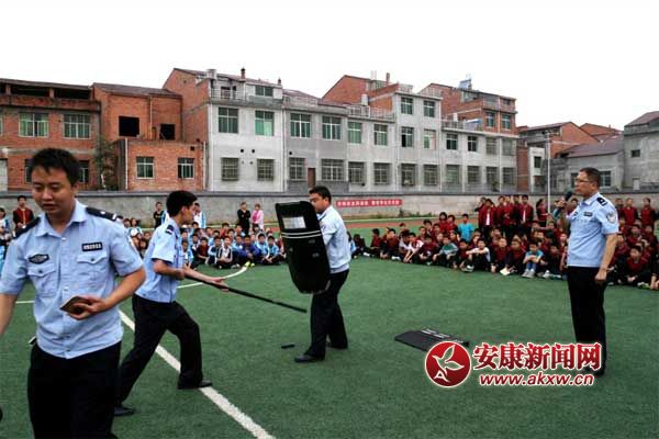 在活動過程中,該所副所長陳小兵先進(jìn)行了法律知識講座。講座中,陳所長針對青少年犯罪的性質(zhì)、特點(diǎn)、根源,結(jié)合青少年的生理、心理特征,以生動的事例,詳實(shí)的資料,通俗的語言,解讀了一個個觸目驚心的青少年犯罪案例,給學(xué)生上了一堂生動的法制教育課。緊接著公安民警又向師生們展示了催淚噴射器、警棍、鋼叉、阻車器等警用裝備并模擬在遇到壞人時應(yīng)如何正確使用這些警用裝備以便最迅速、有效地將壞人制服,師生們聽得聚精會神,博得了師生的陣陣掌聲!
