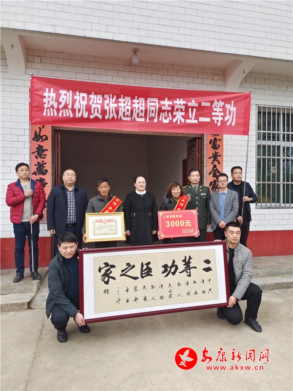在張超超家中,縣委書記劉飛霞、縣人武部長吳杰等為張超超的父母佩戴了“一人立功,全家光榮”綬帶,送上“二等功臣之家”牌匾和慰問金,并代表縣委、縣政府向其父母表示祝賀,感謝他們?yōu)樽鎳囵B(yǎng)人才、為家鄉(xiāng)增光添彩,希望他們一如既往地支持張超超在部隊(duì)工作,爭取更好成績,同時(shí)要求縣鎮(zhèn)村要在生產(chǎn)生活中給予必要的關(guān)心和幫助。