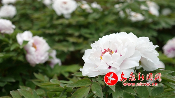 走進牡丹園中,一朵朵牡丹花開正艷、絢麗多彩,陣陣花香沁人心脾,令人陶醉。從空中俯瞰,五顏六色的牡丹花次第開放,妖嬈的花朵掩映在綠色的枝葉中,一團團,一簇簇,開得甚是熱鬧,可謂“百花”齊放、香氣四溢。走近細看,白牡丹綻開著白色的花瓣,雪白多層花瓣中心吐露出金蕊,素雅,端莊;紫牡丹花瓣重疊,雍容華貴,絢麗奪目;粉牡丹恰似少女的臉龐,嬌艷欲滴,煞是可愛!灼灼花海中,游人的嘖嘖驚嘆聲不絕于耳,大伙紛紛拿出手機定格這壯美的牡丹圖。