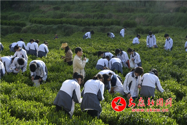 在采茶、沏茶實踐現(xiàn)場,同學們毫不掩飾心中的喜悅,三個一組、五個一群,精心挑選,“茶海”間到處可見學生忙碌的采茶身影。在一片片綠意之間,隨行地理老師們精彩的農(nóng)業(yè)知識講解,同學們了解了認茶、采茶、炒茶等茶藝知識,收獲了傳統(tǒng)農(nóng)業(yè)知識,領略了茶文化的禮儀美德,感受到了勞動意義和價值。