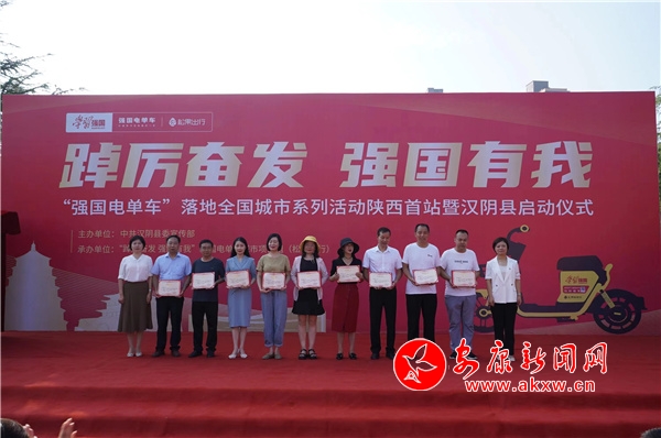活動為2021年度學(xué)習(xí)強國“學(xué)習(xí)之星”獲得者進(jìn)行了表彰,與會領(lǐng)導(dǎo)共同為“強國電單車”揭幕,標(biāo)志著“強國電單車”正式落地陜西省漢陰縣。