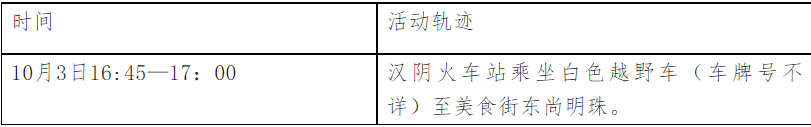 根據(jù)流調(diào)情況,現(xiàn)將漢中一例初篩陽性病例涉及密切接觸者在漢陰縣公共場所活動軌跡公布如下: