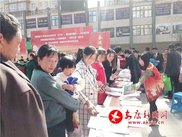 3月3日下午,縣圖書(shū)館在澗池鎮(zhèn)集鎮(zhèn)廣場(chǎng)參加了漢陰縣2023年度文化科技衛(wèi)生“三下鄉(xiāng)”、我們的中國(guó)夢(mèng)----文化進(jìn)萬(wàn)家、文明實(shí)踐宣講團(tuán)黨的二十大精神宣講、“科技之春”宣傳月節(jié)“文化點(diǎn)亮家園”戲曲進(jìn)鄉(xiāng)村集中示范活動(dòng)。縣直多家單位組織參加了此次活動(dòng)。活動(dòng)現(xiàn)場(chǎng)氣氛熱烈,節(jié)目?jī)?nèi)容豐富、形式多樣,有歡快的歌舞、詼諧的小品,醫(yī)務(wù)工作者為廣大村民義診,政法部門(mén)等單位為群眾送政策。縣圖書(shū)館的紅色經(jīng)典圖書(shū)和科技類(lèi)、農(nóng)業(yè)類(lèi)書(shū)刊吸引了附近十里八鄉(xiāng)的群眾前來(lái)觀看,紛紛挑選符合自己口味的書(shū)籍,進(jìn)行現(xiàn)場(chǎng)閱讀。在送書(shū)環(huán)節(jié),市民們爭(zhēng)相登記、咨詢(xún)、關(guān)注公眾號(hào),他們把書(shū)籍拿到手里,如獲至寶,紛紛表示希望縣圖書(shū)館多開(kāi)展這樣的活動(dòng),豐富他們的業(yè)余文化生活。