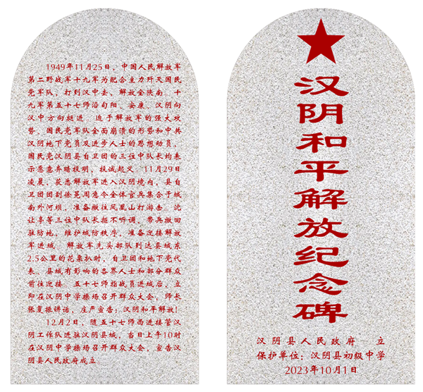漢陰和平解放紀(jì)念碑、紀(jì)念亭矗立于漢陰縣初級(jí)中學(xué)(原漢陰中學(xué)所在地)操場(chǎng)東北角。紀(jì)念碑上“漢陰和平解放紀(jì)念碑”九個(gè)醒目的大字,承載著在中國(guó)共產(chǎn)黨的領(lǐng)導(dǎo)下,漢陰各族人民為爭(zhēng)取解放而進(jìn)行英勇奮斗的光輝歷程。“鐵流開新宇中華啟國(guó)運(yùn),紅纓縛蒼龍古城喜民通。”和平解放紀(jì)念亭上的鎏金匾額則是由漢陰本土知名作家李泉森撰寫,知名書法家張正生所題寫。