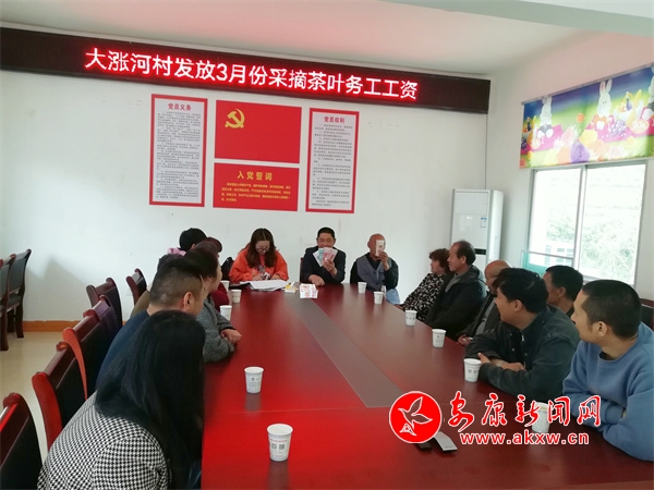 “第一名,二組李正國,15天4100元,第二名……”4月9日,在漢陰縣漩渦鎮(zhèn)大漲河村委會(huì),大漲河茶葉專業(yè)合作社為村內(nèi)和周邊村的采茶工發(fā)放3月份采茶工資74066元,80多名茶農(nóng)領(lǐng)到了春后采茶的第一份工資。