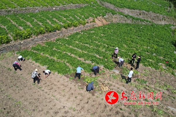 “大家加把勁兒,惠康源公司今天下午要2000斤土豆。”在漢陰縣雙河口鎮(zhèn)黃龍村的土豆種植基地里,駐村第一書記唐建安一邊忙著和村民一起采收土豆,一邊督促進(jìn)度。十余位村民分工有序,忙而不亂,隨著鋤頭的揮舞,一顆顆外觀飽滿、個(gè)頭勻稱的土豆破土而出,分揀、裝袋……田地里每個(gè)人的臉上都掛滿了豐收的喜悅。
