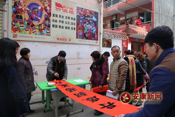 安康新網(wǎng)訊 (通訊員 李鳳琴 敖利明) “厚德載物新風尚,和善余慶春滿堂!蓖诵莞刹繀谴鬆斈玫綍椰F(xiàn)場書寫的春聯(lián)后高興不已,“‘德善’是做……