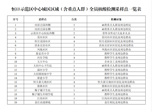 共設(shè)置20個采樣點、53個采樣臺(見附件),由相關(guān)責(zé)任單位統(tǒng)一負(fù)責(zé)采樣點設(shè)置、人員組織、秩序維護(hù),檢測對象按現(xiàn)場工作人員要求,有序到指定地點進(jìn)行采樣,避免人員聚集。