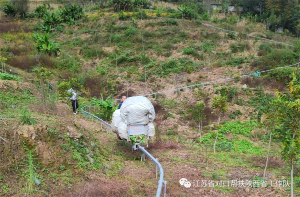 2022年,常州市新北區(qū)對口幫扶嵐皋縣聯(lián)絡(luò)組專門撥付蘇陜協(xié)作資金350萬元,為當(dāng)?shù)匕l(fā)展獼猴桃、碧根果等產(chǎn)業(yè)的村子安裝山地軌道運輸車20公里,直接讓3500畝土地的種植戶受益。軌道運輸車的安裝,讓當(dāng)?shù)厝罕姀拇烁鎰e了依靠人力肩挑背扛的歷史。包括獼猴桃、黃豆、紅薯等在內(nèi)的所有莊稼,從此在地里收獲后,只需要主人裝入軌道運輸車,就可以直接送到農(nóng)用車上,然后拉回家。