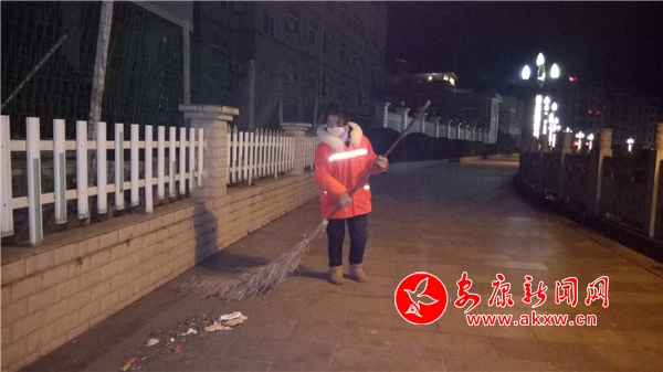 圖為環(huán)衛(wèi)工人吳志美大年初一、初五凌晨街上空無一人的時候,她默默的在清掃大街小巷(筆者晨練偶遇隨拍), 他用一身寒霜溫暖縣城清晨!