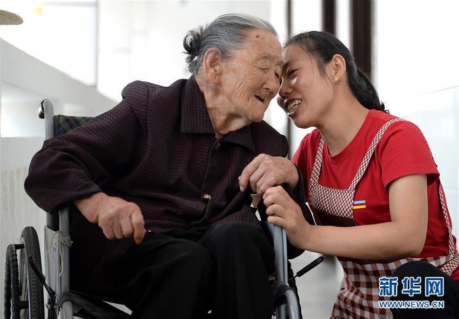 寧陜縣中心敬老院五保失能托養(yǎng)中心內(nèi),護(hù)理員吳偵梅(右)在與托養(yǎng)老人毛榮芝聊天(8月20日攝)。