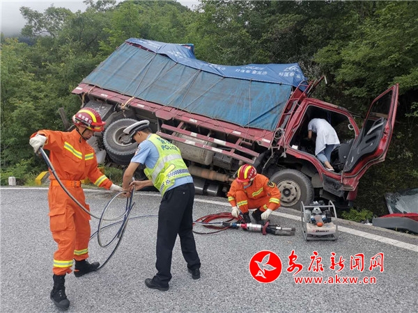 受西漢高速路面養(yǎng)護施工,貨車實施交通管制影響, 210國道貨運車輛激增,交通安全形勢突然嚴峻。7月17日中午13時許,一輛倉柵式輕型貨車滿載一車貨物,由成都沿210國道前往河南,行駛至210國道1392公里+100米處與道路左側(cè)山體碰撞,車頭被撞癟,駕駛員下半身被卡在駕駛室無法脫困,生命垂危。副駕駛被甩出車外。接警后廣貨街中隊迅速出警,第一時間趕到現(xiàn)場,迅速組織各救援單位開展施救。隨后,醫(yī)護人員、消防官兵、保險業(yè)務(wù)員先后到達,四家單位有條不紊地聯(lián)合救援即刻展開。交通警察對事故路段臨時性實施交通管制,防止發(fā)生次生事故。同時配合消防官兵對卡在車內(nèi)的駕駛?cè)诉M行施救。醫(yī)護人員對傷員進行前期救治,包扎、輸液、輸氧。保險公司派出救援車輛對遺散的貨物進行收集,對受困車輛進行施救。歷時兩個小時,受困人員被救出,送醫(yī)院治療。