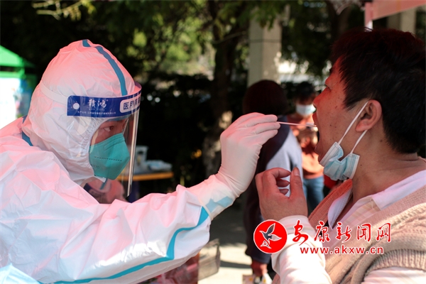 在城北社區(qū)幸福花園核酸檢測(cè)采樣點(diǎn),核酸采樣正在井然有序地進(jìn)行著。醫(yī)護(hù)人員全副武裝,溫柔輕聲引導(dǎo),手上動(dòng)作不停,按照核酸檢測(cè)采樣要求,嫻熟地對(duì)前來(lái)核酸檢測(cè)的群眾進(jìn)行咽拭子采樣。