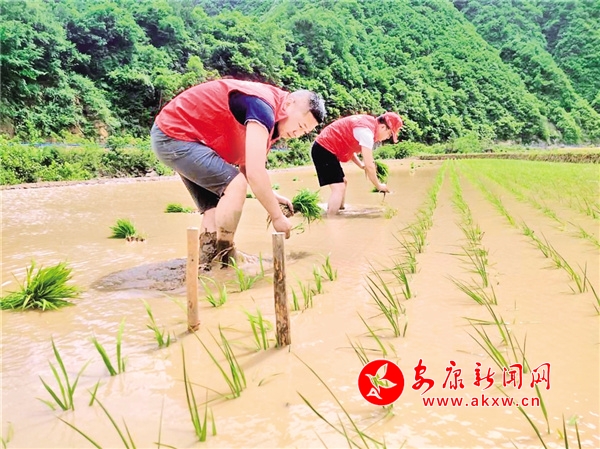 本網訊(通訊員 陳陽軍)農忙時節(jié)不等人。不久前,地處秦嶺腹地的寧陜縣龍王鎮(zhèn)棋盤村,有一群人,他們身穿“紅馬甲”搶抓好時節(jié)移栽秧苗,在水田里來回穿梭,幫助村民把一株株秧苗整齊有序地插入水田里,在藍天白云的映襯下,田間地頭呈現出一幅忙碌的夏耕畫卷。