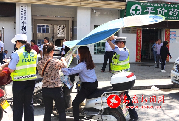 行動中,民警在人流、車流量較大的交通主干道、十字路口設點檢查,嚴格依據(jù)《中華人民共和國道路交通安全法》的相關規(guī)定,對非法加裝遮陽傘的電動車、摩托車做到發(fā)現(xiàn)一輛、查糾一輛、拆除一輛、教育一輛。堅持查處與教育相結合,耐心講解加裝遮陽傘的危害及嚴重性,對電動車安裝遮陽傘的,責令自行當場拆除;對摩托車安裝遮陽傘的,根據(jù)相關規(guī)定責令其強制拆除恢復原貌,并依法進行處罰。