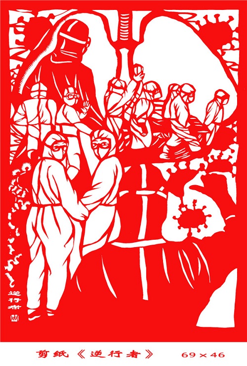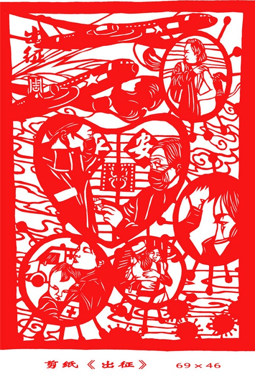 周玉珍作為安康市平利縣的一名小學(xué)美術(shù)教師,在做好學(xué)生、家長疫情防控宣傳教育的同時(shí),戰(zhàn)“疫”中的許多瞬間,令她分外感動(dòng)。她借個(gè)人居家防護(hù)的時(shí)機(jī),完成了《出征》《逆行者》《戰(zhàn)疫》三幅剪紙作品,用鮮紅的剪紙記錄下了那些令人感動(dòng)的瞬間。