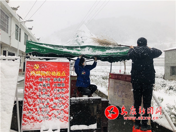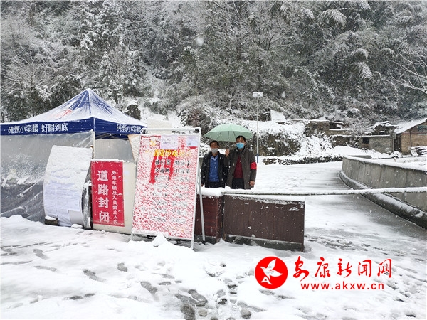 在三坪村勸返點(diǎn),一夜的大雪連示意牌都遮得嚴(yán)嚴(yán)實(shí)實(shí)。執(zhí)勤的鎮(zhèn)社保站干部陳曉虎、李玲和村干部楊昌華早早地就來到這里,一齊動(dòng)手,抖落掉帳篷上的積雪,用掃帚、鐵鏟把路面清掃得干干凈凈。“冰雪天氣出行一定要注意安全,車輛要裝上防滑鏈”,顧不上已經(jīng)成了“雪人”,他們在做好疫情防控勸導(dǎo)勸返工作的同時(shí),還充當(dāng)起了交通安全引導(dǎo)員。直到手被凍得握不住筆了,這才顧得上生起一盆取暖的炭火。