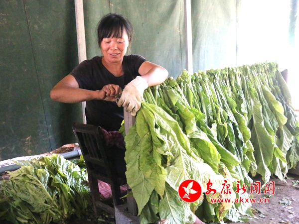 在龍洞河村廖明清的烤煙房外,65歲的鄧明珠正熟練的挑揀、捆綁,幾分鐘就把一桿煙葉綁好了。鄧大娘一邊干活一邊笑著說:“通過扶貧搬遷搬到了山下,兒女在外務工,乘著現(xiàn)在我還能干,給兒女減輕一些負擔,我已在這里干了幾個月了,每天100元的工資,土地也流轉給合作社,兩項加起來1萬多塊錢還是掙得到的。