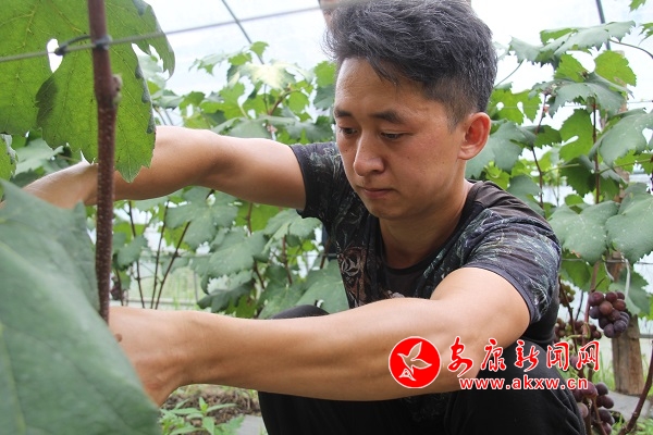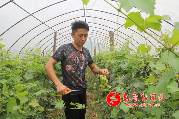 6年前,政府為引導(dǎo)村民發(fā)展生態(tài)產(chǎn)業(yè)種植,提高農(nóng)業(yè)產(chǎn)業(yè)收入,下大力投入資金將原先的露天菜地建成了生態(tài)產(chǎn)業(yè)園連片設(shè)施大棚。但很多本地村民因?yàn)椴欢r(nóng)業(yè)科技,不懂農(nóng)業(yè)產(chǎn)業(yè)市場,對(duì)建好的設(shè)施大棚望而卻步。譚文軍是第一個(gè)到產(chǎn)業(yè)園租賃設(shè)施大棚栽種葡萄的外村人。當(dāng)年,他引進(jìn)了戶太8號(hào)品種1萬余株,栽種30畝60個(gè)大棚。從2016年開始,這批葡萄進(jìn)入采摘期,從剛開始的畝產(chǎn)2000斤,到現(xiàn)在畝產(chǎn)3000斤,譚文軍說,明年進(jìn)入豐產(chǎn)期,畝產(chǎn)還將提高到4500斤左右。