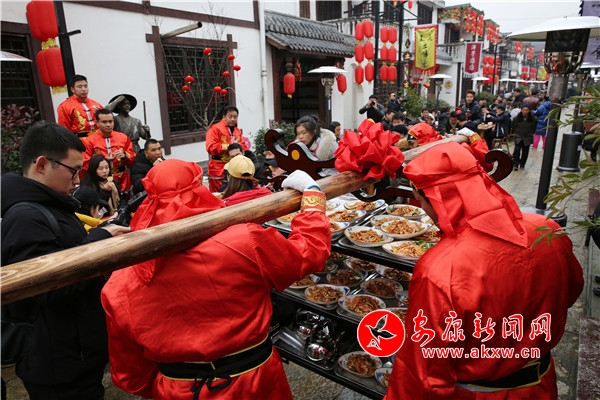 庖湯會菜品28道,八涼六熱十二道蒸菜兩道湯。美食不斷登場上桌的同時,兩名披紅掛彩的當?shù)匦』镒釉谘缦习ぷ辣硌蓐兡细鞣N花拳,把庖湯會的氣氛推向高潮。古鎮(zhèn)長街、方桌條凳、游客們和當?shù)厝罕妵谝黄,端起大黑碗,喝一口自釀美酒、吃一塊當?shù)刎i肉、劃一局石泉花拳。