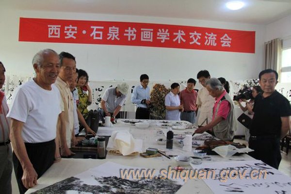 6月20日,西安市書(shū)畫(huà)藝術(shù)研究院的著名書(shū)畫(huà)家蔡嘉礪、景德慶、張冠福、王振民、武儒昌、南云川、蔣永明、李延等一行二十人,同石泉的王開(kāi)明、李昌玉等書(shū)畫(huà)家門聚……