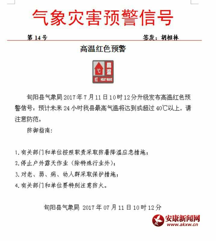 安康新聞網(wǎng)訊(通訊員 錢夢莉)旬陽縣氣象局2017年7月11日10時12分升級發(fā)布高溫紅色預警信號:預計未來24小時我縣最高氣溫將達到或超過40℃以上,請注意防范。
