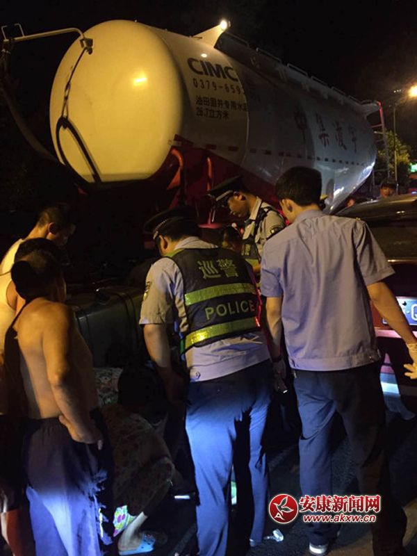 7月21日晚23時(shí)許,旬陽(yáng)縣公安局巡警大隊(duì)康華園巡邏民警接到過(guò)路的群眾報(bào)警,稱:城區(qū)周家溝附近有交通事故,可能有人受傷。民警立即趕往事發(fā)地點(diǎn),沿途發(fā)現(xiàn)交通以堵塞,長(zhǎng)長(zhǎng)的車隊(duì)一眼望不到頭,趕到事發(fā)地點(diǎn)后,發(fā)現(xiàn)一油罐車車底躺著兩個(gè)人,一男一女系夫妻關(guān)系,女子的腿部受傷嚴(yán)重,不能移動(dòng),當(dāng)民警趕到現(xiàn)場(chǎng)后,交警以及救護(hù)車隨后趕到,巡邏民警配合救護(hù)人員將躺在油罐車下的兩人救出,及時(shí)送往醫(yī)院救治。