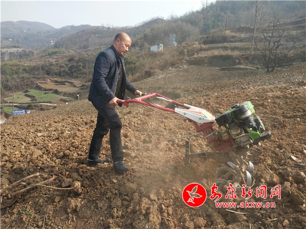 在金寨鎮(zhèn)譚家院社區(qū)六組,45歲的煙農(nóng)朱章斌正在煙田熟練操縱著旋耕機(jī),他趁著最近晴好天氣,啟動春耕整地工作。
