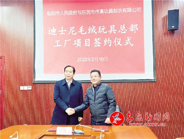 旬陽市委副書記、代市長羅本軍(左一)出席迪士尼毛絨玩具總部工廠項(xiàng)目簽約儀式