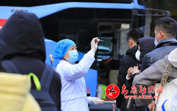 上午8點,帶著行李、佩戴口罩的返崗人員們齊聚在縣中心廣場。在該縣人社局工作人員的組織下,員工們有序地依次經過體溫檢測、身份核實、個人健康狀況查驗、安全檢查,踏上返崗復工復業(yè)的旅程。