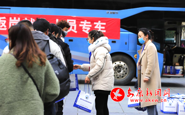 為保障返崗人員的安全健康,工作人員對專車內外進行了反復消毒,運輸車輛滿載率不超過50%,實施乘客隔位、分散就坐,在每輛車中選取一名車隊長,委托人力資源服務公司跟車全程護航,貼心服務。還為每名司乘人員準備了裝有口罩、餅干、礦泉水等物資的“愛心包”。