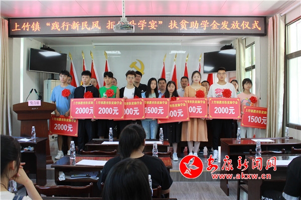 在升學(xué)禮上,宣讀了《上竹鎮(zhèn)2020年度“踐行新民風(fēng)•不辦升學(xué)宴”教育扶貧助學(xué)活動(dòng)實(shí)施方案》,按照一本2000元,二本1500元的標(biāo)準(zhǔn)為18學(xué)生發(fā)放了扶貧助學(xué)金,共計(jì)30500元。學(xué)生代表印想想發(fā)言,她表示,堅(jiān)決向“升學(xué)宴”“謝師宴”說(shuō)不,自己會(huì)更加努力學(xué)習(xí),不負(fù)眾望,知恩感恩,做文明新風(fēng)的倡導(dǎo)者。學(xué)生家長(zhǎng)代表陳昌瓊在儀式上發(fā)言,將一如既往地弘揚(yáng)新民風(fēng),自覺(jué)抵制大操大辦、鋪張浪費(fèi),做移風(fēng)易俗的踐行者。在活動(dòng)現(xiàn)場(chǎng),學(xué)生家長(zhǎng)也倍感自豪,臉上洋溢著幸福的笑容,紛紛表示,黨委政府通過(guò)開(kāi)展新穎的慶;顒(dòng),給孩子們留下珍貴的記憶,既達(dá)到了革除陋習(xí)的目的,讓“里子”好,又讓百姓“面子”亮。qcL安康新聞網(wǎng)