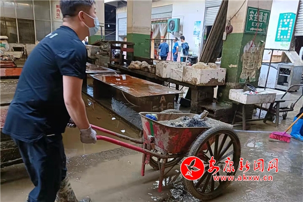 在自救的同時,9月20日起,縣市場監(jiān)管局的干部們同步投入到重災(zāi)區(qū)農(nóng)貿(mào)市場的清淤工作中。在此次災(zāi)情中,農(nóng)貿(mào)市場受災(zāi)最為嚴(yán)重,各類設(shè)施受損嚴(yán)重,垃圾污泥成片,污水橫流,一片狼藉,完全不能投入使用。在農(nóng)貿(mào)市場,大家自帶工具集中投入到這場農(nóng)貿(mào)市場“美容戰(zhàn)”中,加緊清理淤泥、疏通水渠、打掃地面。 淤泥太厚了,他們就用刮板推;水渠堵了,他們就用手去疏通;地面太臟了,他們就用沖水管去沖;污泥流不出去,他們就用小推車一車一車地運.......面對受災(zāi)的商戶,干部們認(rèn)真做好安撫,鼓勵經(jīng)營戶重拾信心,重建美麗家園。