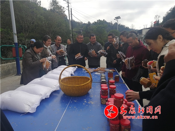 在黃金村駐村工作隊(duì)組織下,20戶貧困戶把自家生產(chǎn)加工的土特產(chǎn)品運(yùn)到村中心廣場,廣場上堆放著苦蕎、土蜂蜜、土雞蛋、包谷酒、干蘿卜片、豆腐乳、黃豆醬和新鮮丹參等產(chǎn)品,幫扶干部踴躍購買,現(xiàn)場產(chǎn)品銷售一空。活動共銷售了20戶貧困戶11種農(nóng)副產(chǎn)品,銷售額達(dá)1.2萬余元。
