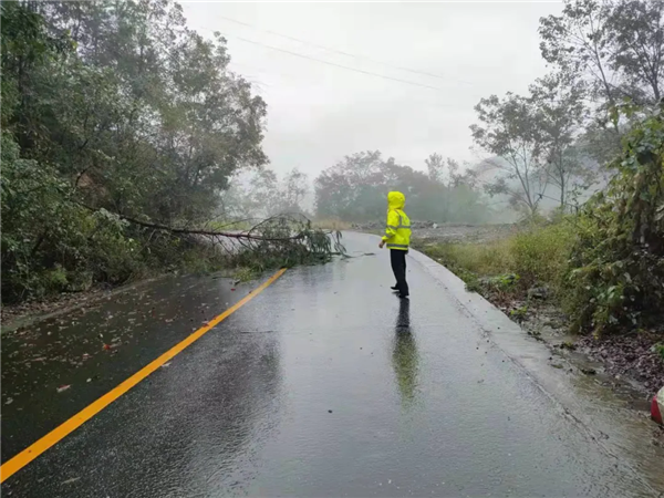 310省道38KM+800M因大雨造成大樹(shù)倒塌占據(jù)半幅道路。