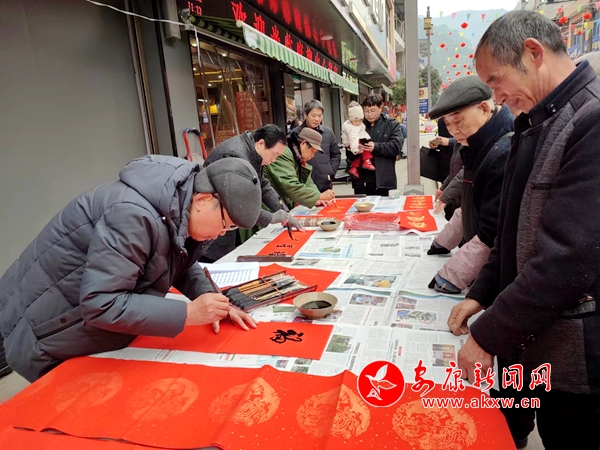 在一長排擺放整齊的寫字桌前,圍滿了來自四面八方的上百名群眾,個個喜氣洋洋,爭先認(rèn)領(lǐng)自己心儀的過年春聯(lián)。“春回大地龍翔九天,福滿人間鳳舞五福。橫批:龍年行大運(yùn)”。一幅幅吉祥喜慶、一句句恩澤華夏的美好祝愿被老百姓爭先領(lǐng)取。