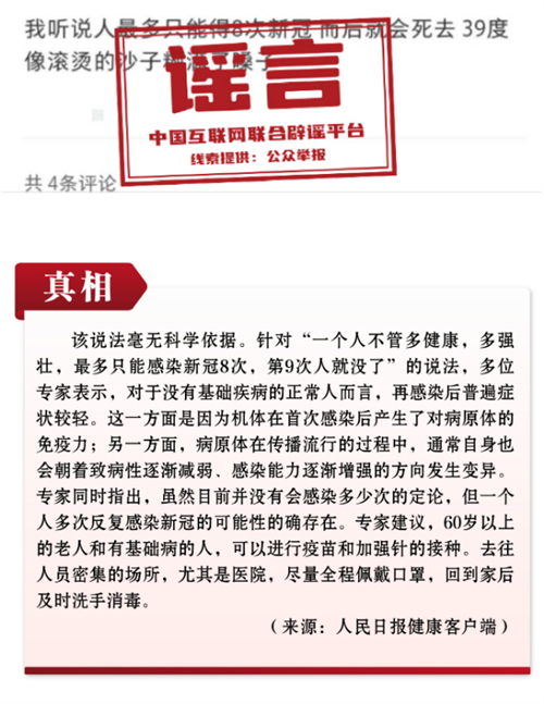 傳“偽科普”販賣焦慮引恐慌。5月以來,全國多地入夏,迎來炎熱高溫天氣,與季節(jié)關(guān)聯(lián)性較強(qiáng)的科普信息備受關(guān)注,“空調(diào)反復(fù)開關(guān)能省電”“夏天吃‘苦’勝似進(jìn)補(bǔ)”等誤區(qū)信息也隨之被炒作、散布。特別是近來新冠“二陽”病例增多,“新冠抗體半年保護(hù)期”“新冠病毒新型變異株”等信息在網(wǎng)上引發(fā)熱議,給民眾心里平添“忐忑”。于是,有人借機(jī)搭蹭熱點(diǎn),以“科普”之名捏造“一個人不管多健康,多強(qiáng)壯,最多只能感染新冠8次,第9次人就沒了……”等聳人聽聞的謠言,盡管有專家駁斥其“純屬無稽之談,毫無科學(xué)依據(jù)”,但仍在一定程度上激發(fā)了部分人群的恐慌情緒。