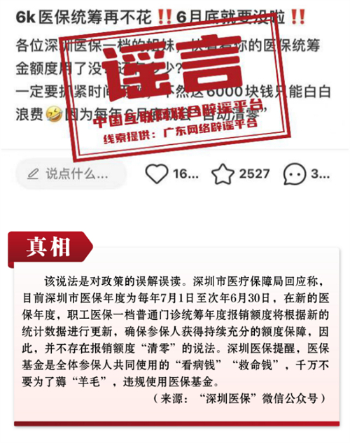 謠言6:深圳醫(yī)保統(tǒng)籌額度再不花,6月底就“清零”?