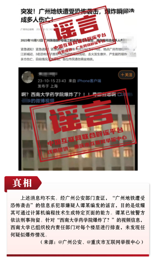 濫用AI技術(shù)造謠值得警惕。個別網(wǎng)民為博眼球、蹭流量,蓄意編造傳播聳人新聞,觸碰法律紅線。10月份網(wǎng)傳多起所謂的“爆炸事故”、惡性刑事案件,事后均被證實(shí)為網(wǎng)絡(luò)謠言。如利用編程和AI技術(shù)編造“廣州地鐵遭受恐怖襲擊”“安徽涇縣發(fā)生校園傷人事件,多人傷亡”等惡性謠言,憑空捏造“西南大學(xué)藥學(xué)院發(fā)生爆炸”“河北保定化糞池爆炸致1死5重傷”等虛假信息,制造社會恐慌。在“三人成虎”的傳播效應(yīng)之下,網(wǎng)民若不明就里、輕易相信,就會成為謠言傳聲筒,造成不良社會影響。