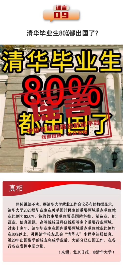 虛構(gòu)社會熱點(diǎn)混淆視聽。隨著春節(jié)日益臨近,學(xué)生進(jìn)入寒假、全國文旅爆火,然而熱鬧之下卻有人捕風(fēng)捉影、歪曲事實,利用當(dāng)下熱點(diǎn),傳播虛假信息。如謠傳“‘侵華日軍南京大屠殺遇難同胞紀(jì)念館’更名為遇難同胞紀(jì)念館”純屬子虛烏有,居心不良。教育話題上,謠言“義務(wù)教育教學(xué)改革實驗區(qū)‘縮短學(xué)制’‘取消中考’”抓住公眾對升學(xué)議題的關(guān)心關(guān)切,渲染不滿情緒;謠言“清華畢業(yè)生80%都出國了”不僅罔顧事實,還刻意誤導(dǎo)公眾,抹黑高校和我國教育工作。此外,關(guān)于“緬北電詐團(tuán)伙背后有溫州民間資本介入”的所謂“小道消息”,經(jīng)公安機(jī)關(guān)查實也純屬造謠者自導(dǎo)自演、尋釁滋事。