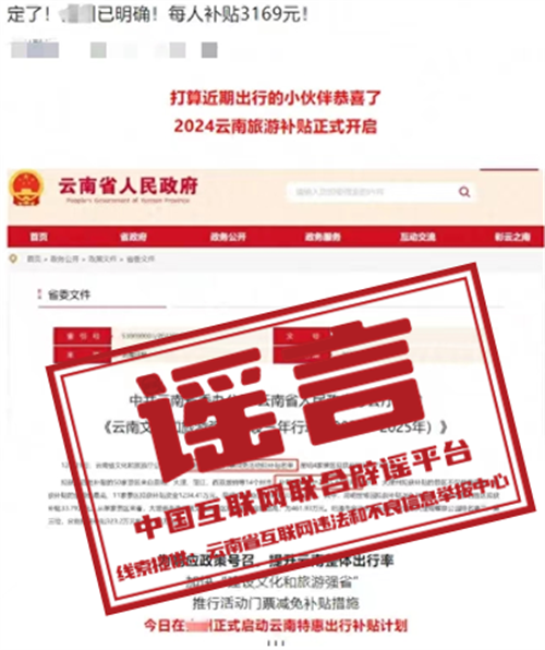 真相:近期,網(wǎng)絡平臺上出現(xiàn)多條題為《定了!XXX已明確!每人補貼3169元!》的信息,聲稱云南官方正在發(fā)放大額旅游補貼,游客花499元就可享受6天5晚云南深度游。這些帖文還附有一張《中共云南省委辦公廳云南省人民政府辦公廳印發(fā)〈云南文化和旅游強省建設三年行動(2023—2025年)〉》的截圖。對此,云南省文化和旅游廳綜合執(zhí)法監(jiān)督局發(fā)布辟謠聲明稱,經(jīng)核實,網(wǎng)傳《定了!XXX已明確!每人補貼3169元!》相關(guān)帖文均為不實消息。提醒廣大消費者在購買旅游產(chǎn)品時,共同抵制“不合理低價游”,如遇出現(xiàn)“特惠出行”“限時補貼”等字樣產(chǎn)品,請謹慎購買,避免“貪便宜,出大事”。(來源:@云南省文旅執(zhí)法)