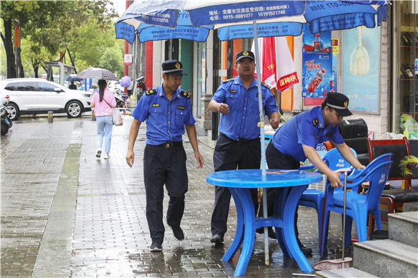 2022年7月19日,漢濱城管分局新城執(zhí)法大隊的執(zhí)法人員,冒著小到中雨,沿著巴山東路清理整頓占道經(jīng)營和亂停亂放等不良行為。(李元武)ej3安康新聞網(wǎng)