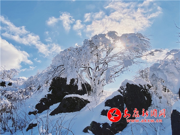 陽光透過樹縫,灑向白茫茫的草甸,萬物潔凈如新。站在草甸之上,環(huán)顧四周,美景盡收眼底,山舞銀蛇襯之藍(lán)天雪地,讓人嘆為觀止。