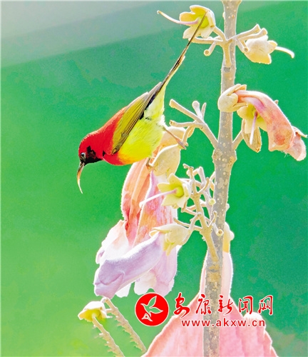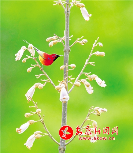 桐花鳳,是經(jīng)常出現(xiàn)在古代文人墨客筆下的吉祥鳥。但因很多人從未見過桐花鳳,遂將桐花鳳與綠毛幺鳳等混淆起來。經(jīng)今人翔實(shí)考證,才證實(shí)古“桐花鳳”就是現(xiàn)今的“太陽(yáng)鳥”。太陽(yáng)鳥象征著祥瑞、吉祥和諧、鳳凰齊飛、太陽(yáng)重升、身化火焰而使人間恢復(fù)光明。它還是熱愛光明、追求光明、獻(xiàn)身光明的象征。太陽(yáng)鳥也是太陽(yáng)崇拜和鳥崇拜相結(jié)合的產(chǎn)物。太陽(yáng)鳥世界共有14種,中國(guó)有6種,被譽(yù)為“東方的蜂鳥”“月下老人”,再加上太陽(yáng)鳥的寓意如此之好,太陽(yáng)鳥一直受到人們的喜愛與青睞。(圖文 張東風(fēng) )