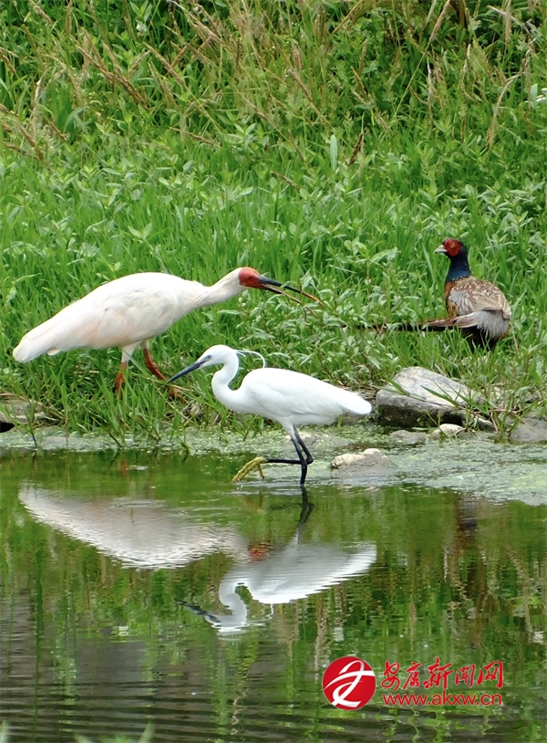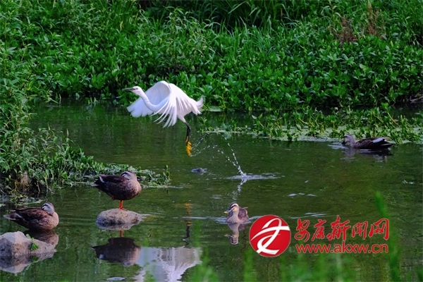 晨光熹微或夕照熔金時,朱鹮掠過荷塘,翅尖點水銜起游魚;蒼鷺與白鷺獨立淺灘,如雪影倒映清波;牛背鷺追逐耕牛腳步,驚起的草蟲成了它的盛宴;更有池鷺、黑水雞、環(huán)頸雉、白胸苦惡鳥穿梭林間,聲聲清啼與潺潺水韻交織,譜寫月河生生不息的生態(tài)樂章。