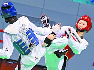 張夢宇(右)在跆拳道女子67公斤級(jí)為廣東代表團(tuán)再添一金。新華社記者 郭晨 攝